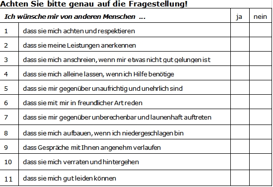 Überlegen Sie doch bitte einmal, was Sie erwarten oder wünschen, wie Menschen mit Ihnen umgehen oder nicht umgehen sollen. Beantworten Sie dazu bitte die unten aufgeführten Fragen.